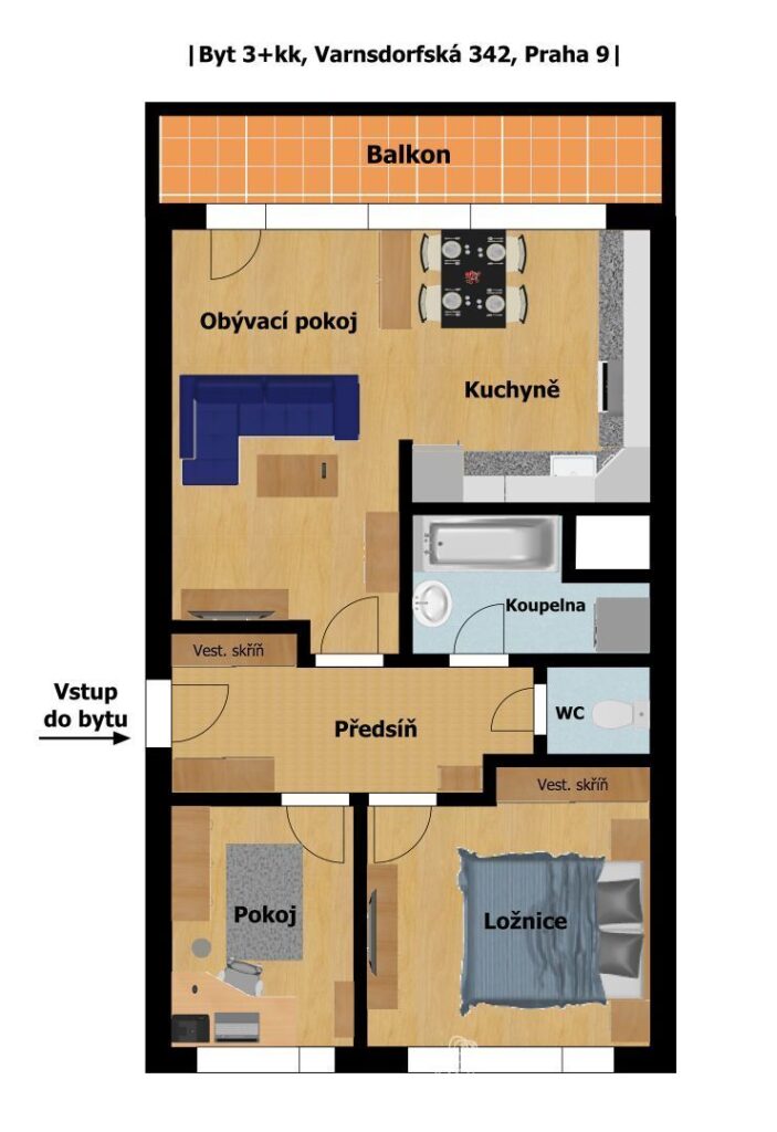 Na vstupní halu s vestavěnou skříní navazuje prostorný obývací pokoj s kuchyňským koutem, který nabízí dostatek prostoru pro rodinné večery nebo setkání s přáteli. Z obývacího pokoje se dostanete na prostornou lodžii o rozloze 6 m2, kde si můžete vychutnat klidné chvíle s výhledem na okolní zeleň. Dále se v bytě nachází ložnice a pokoj, koupelna s vanou i oddělené WC. K bytu náleží také praktická komora na chodbě s dostatkem úložného prostoru.