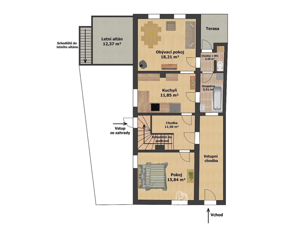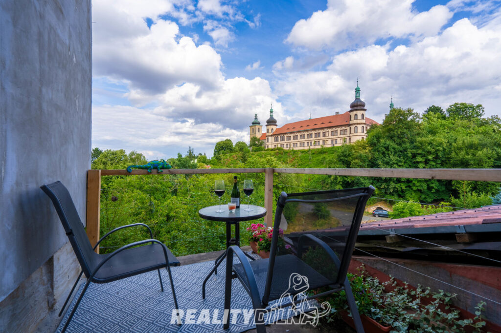 – Přízemí: kuchyň, obývací pokoj, ložnice, koupelna, WC (obložení, vana/sprchový kout) a chodby s technickým koutem, menší terasa s výhledem na zámek a zahradu a větší terasa s altánem před rekonstrukcí vhodná k pořádání akcí a grilování.