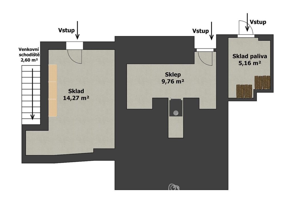 – Sklepy: 1x vinný sklípek, 1x dílna, 1x technický prostor. Vše samostatný vchod ze zahrady.