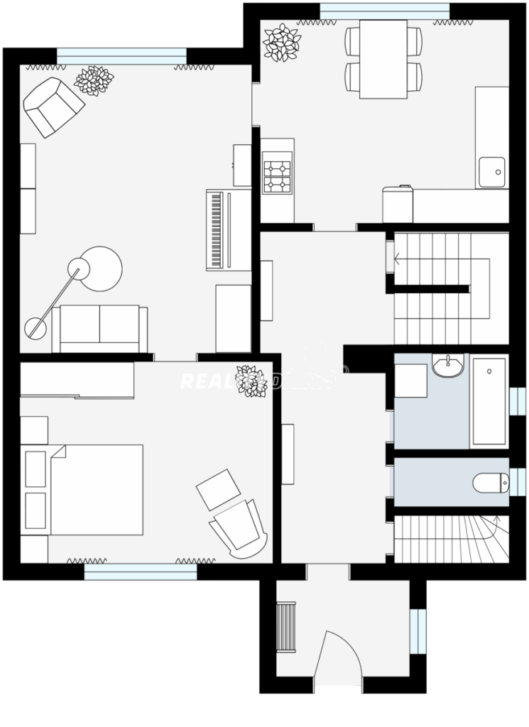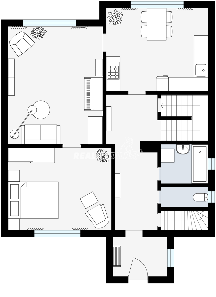 Dispozice: 3+1 (101 m²) + půda (25 m²) + sklep (10 m²) + zahradní altán (pracovna/kolárna = 13 m²) + oplocená zahrada a zastavěná plocha (465 m²).